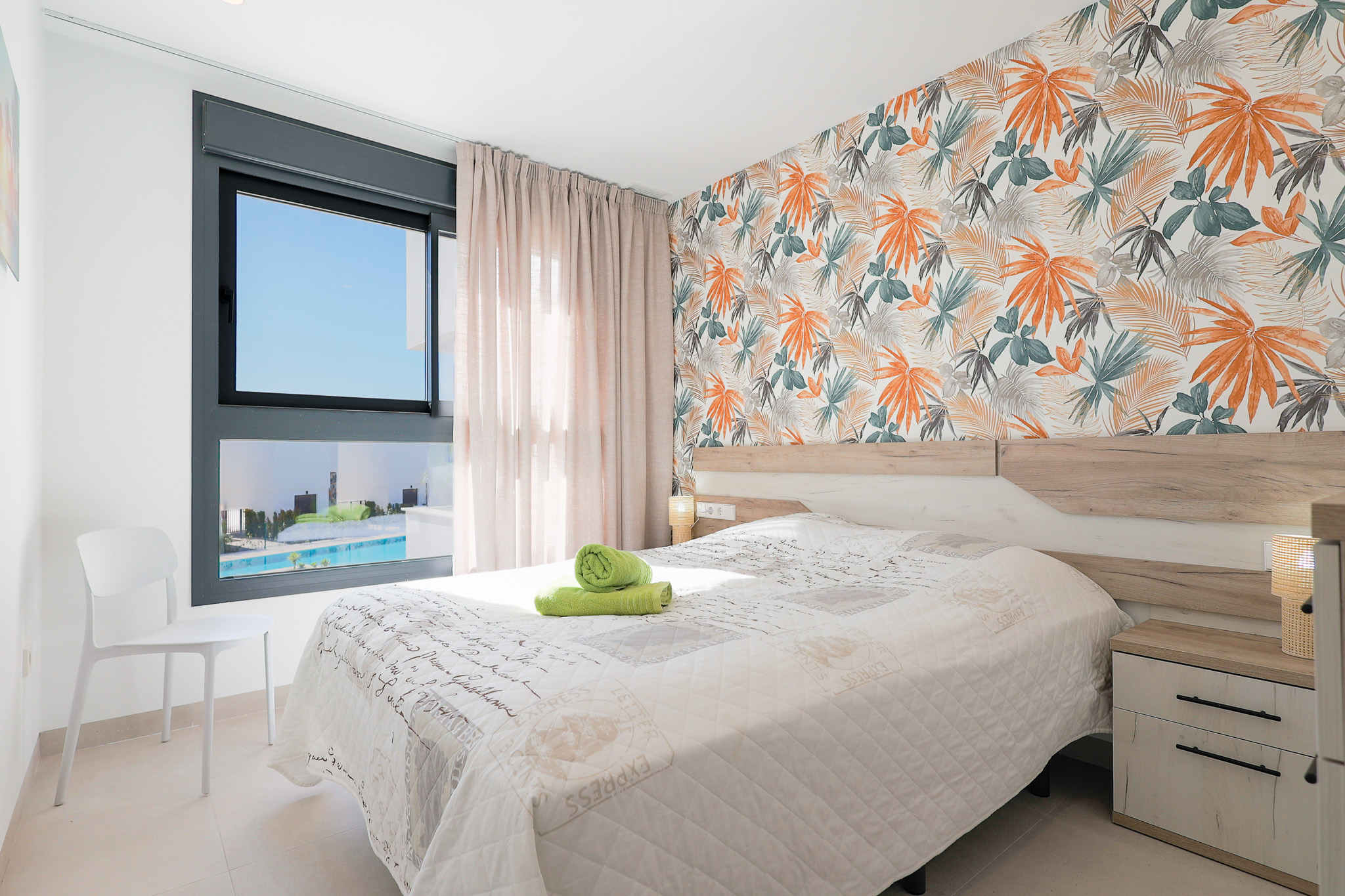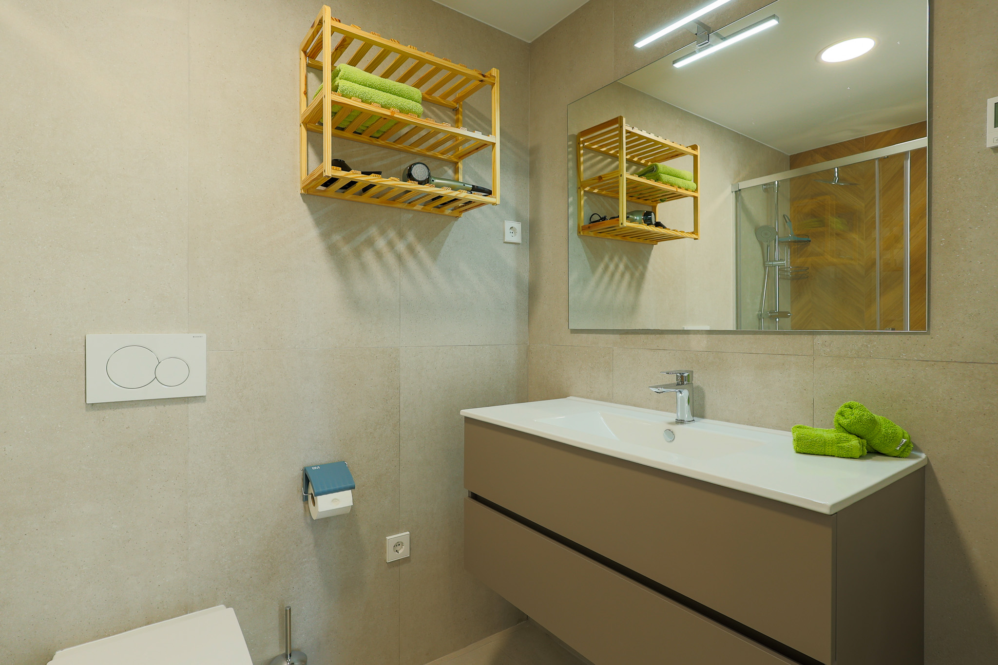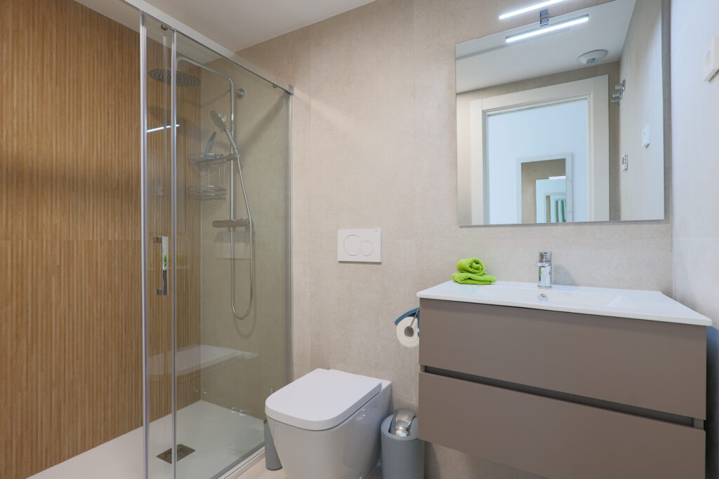De twee slaapkamers bieden rust en privacy. Eén slaapkamer heeft een comfortabel tweepersoonsbed en de andere twee eenpersoonsbedden die eenvoudig samengevoegd kunnen worden. Beide slaapkamers beschikken over ruime inbouwkasten. De badkamers zijn modern en voorzien van een inloopdouche en vloerverwarming. Extra praktisch is de aparte wasruimte met wasmachine, droger en andere voorzieningen. Handdoeken en badlakens zijn aanwezig.