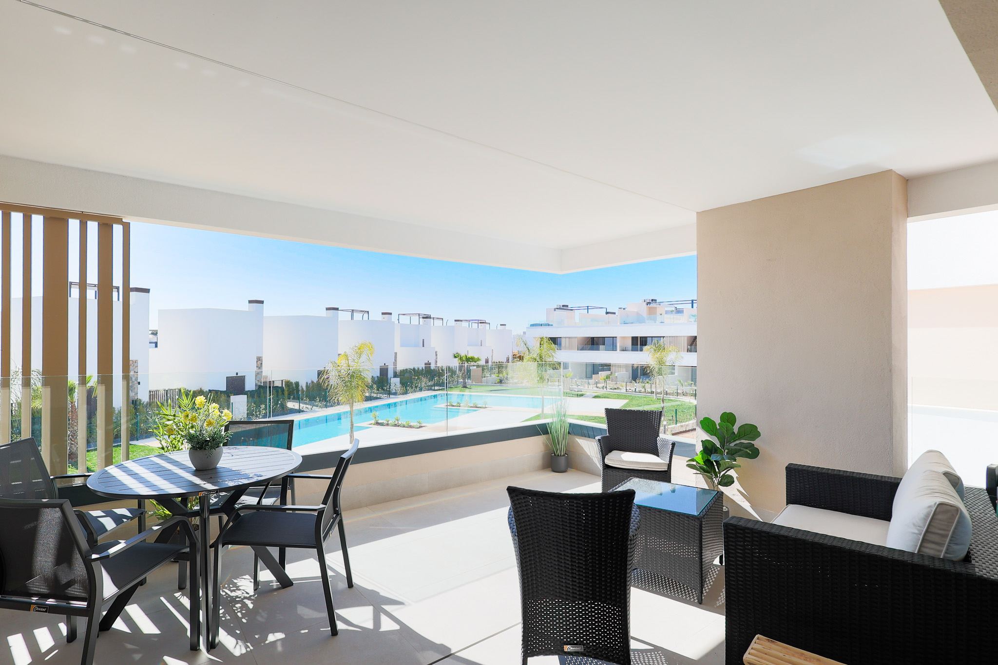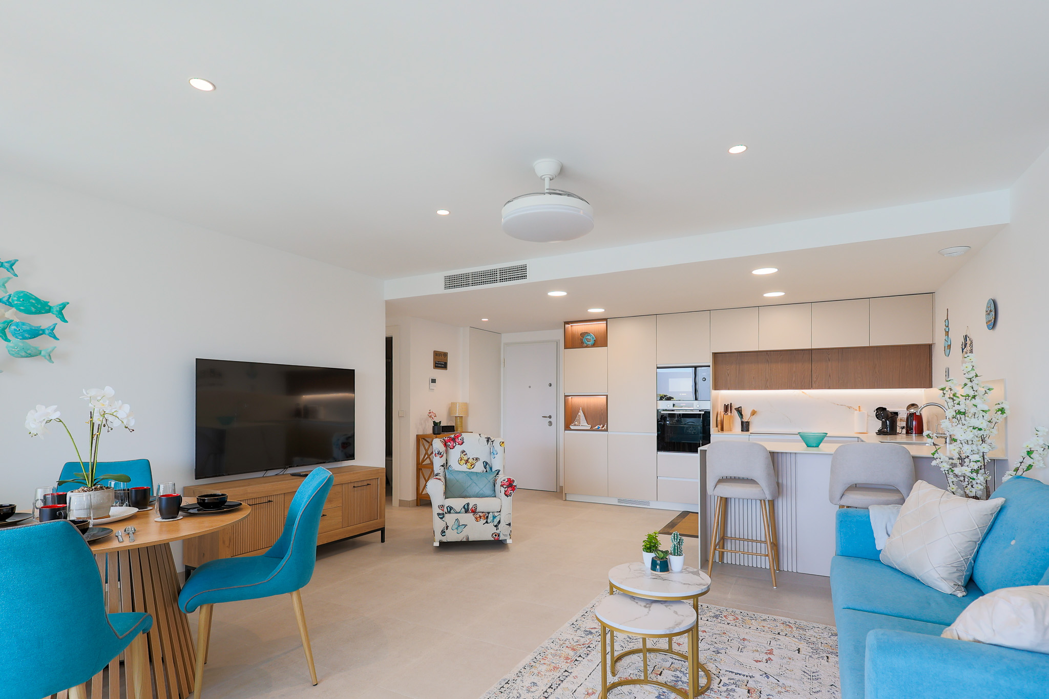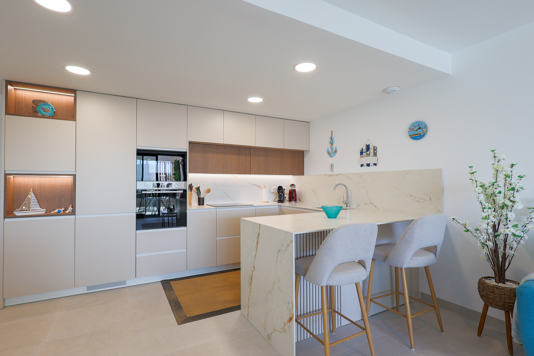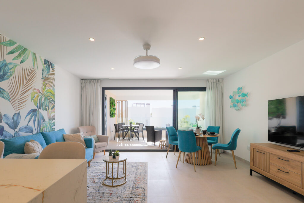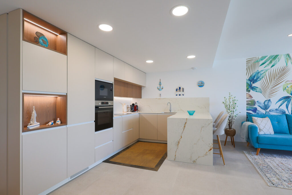 Het ruime Santa Rosalia Appartement van 105 m² combineert luxe, comfort en een toplocatie binnen Santa Rosalia Lake & Life resort, op slechts 200 meter van de schitterende blauw glinsterende lagune. De open keuken is modern, stijlvol en volledig uitgerust met inbouwapparatuur zoals magnetron, oven, vaatwasser en een 185 liter koel-vriescombinatie, ideaal om culinaire wensen te vervullen. De woonkamer is licht en elegant ingericht met een luxe bank, fauteuils, een ronde eettafel en barkrukken aan het kookeiland. Vanuit de woonkamer loop je zo het ruime terras op met eettafel en loungehoek, waar je geniet van het zwembad, de Spaanse zon en het prachtige uitzicht. Het is de perfecte plek voor onvergetelijke momenten aan de Costa Cálida.